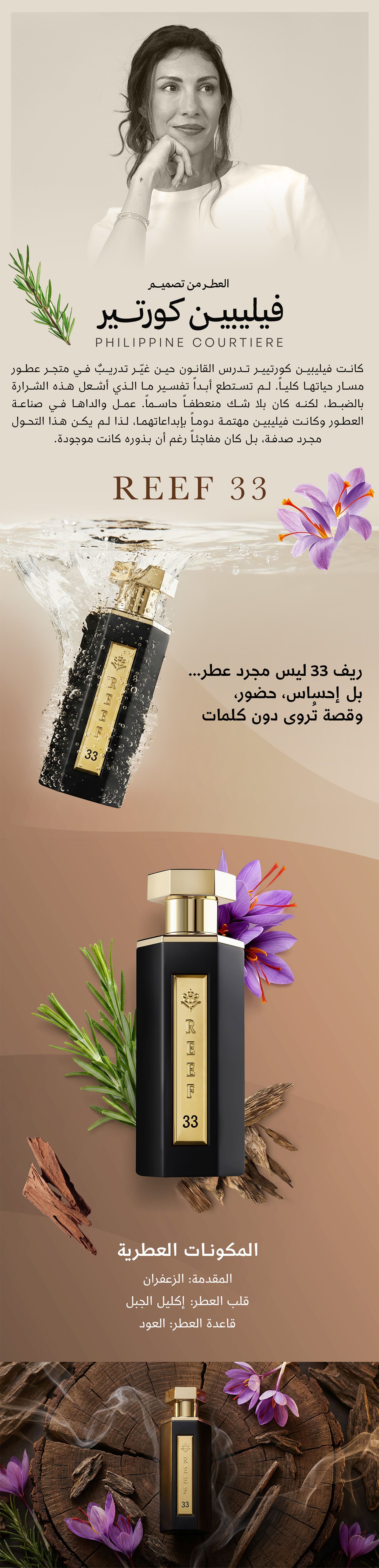 في "ريف 33"، تلتقي الحرفية العالية بروح الخيال. يفتتح العطر آفاقه بوهج الزعفران الذي يداعب الحواس برقة، وسرعان ما ينسجم إكليل الجبل ليخلق توازنًا مذهلًا يفيض بالرقي. ومع استقرار العطر، يتجلّى العود بوقاره ودفئه ليمنح المزيج عمقًا لا يُضاهى وثباتًا يدوم طويلًا. إنه توقيعك الشخصي الذي يعبّر عن ذوقك الرفيع وحضورك المهيب.